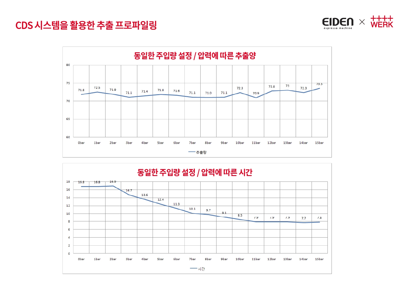 동일한 조건(분쇄도, 원두양 등등)에서 추출 프로파일을 다양하게 바꾸어도 추출양에서 큰 차이가 발생하지 않았습니다. 이것은 정해진 주입량을 정확하고 일정하게 내뱉는다는 것이 됩니다.