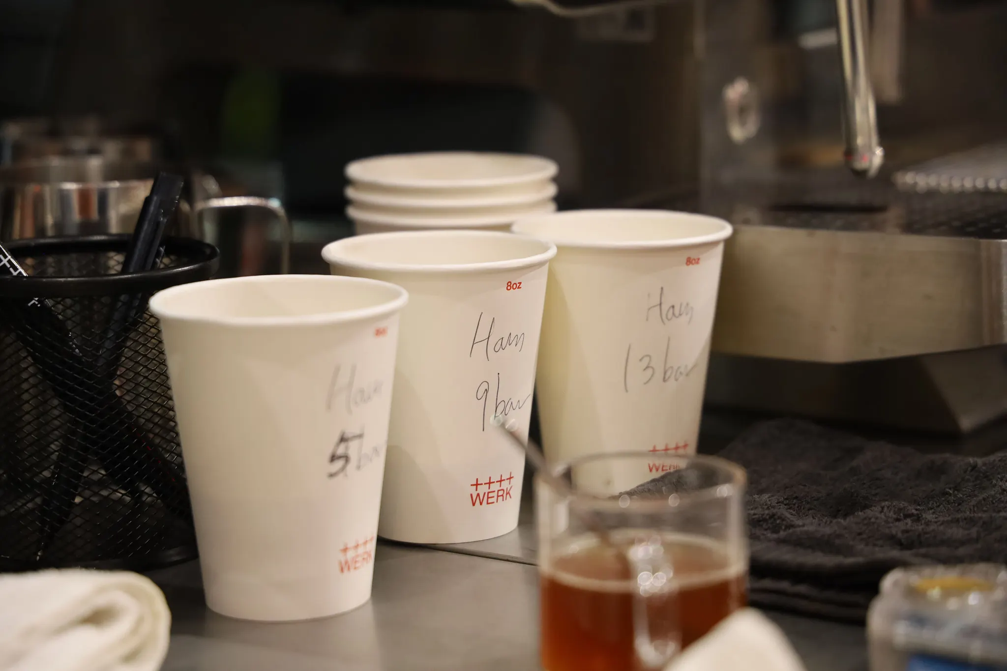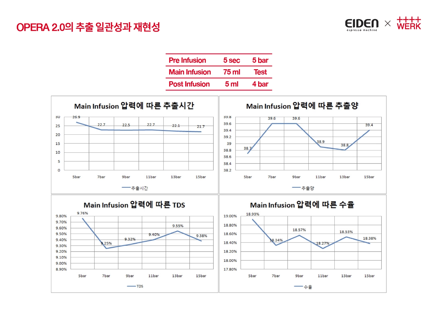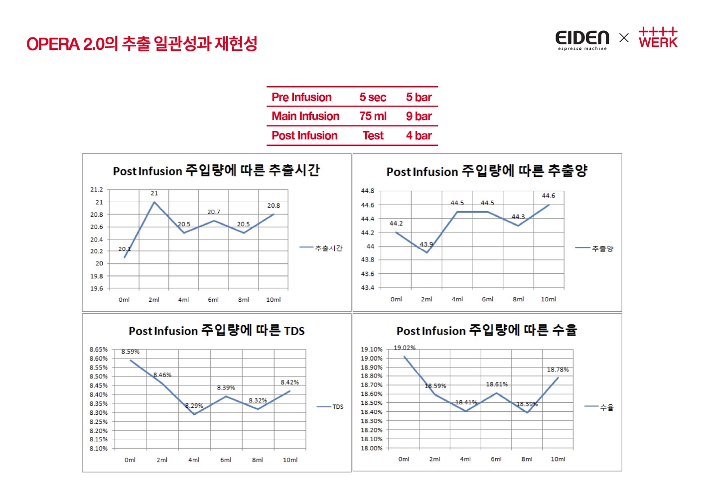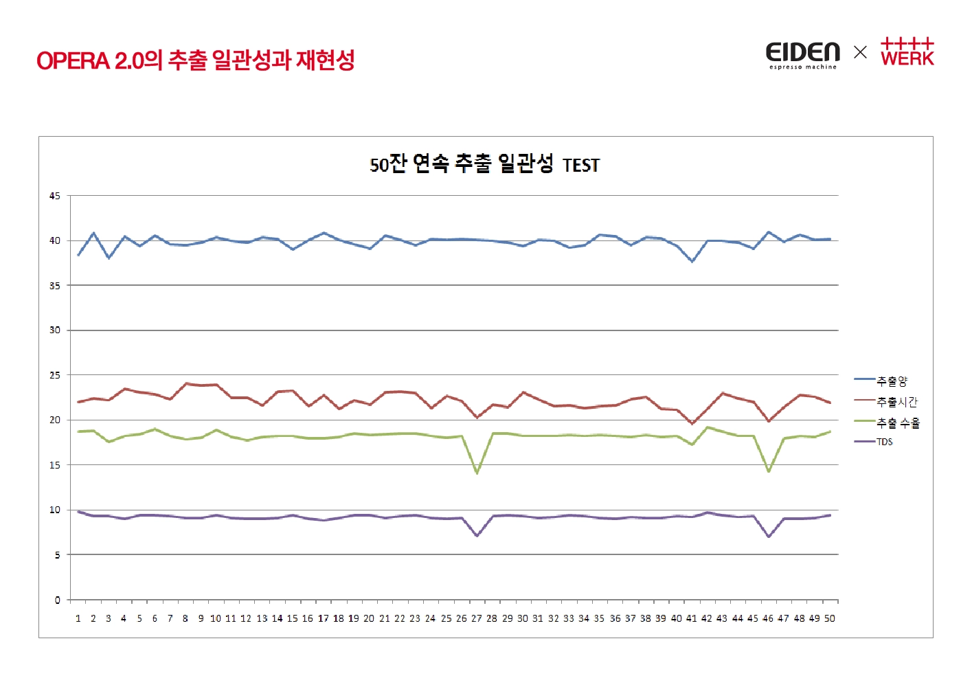 위 5가지 변수(Pre infusion 시간, 압력, Main infusion 압력, Post infusion 주입양, 압력)를 조절하는 다양한 프로파일에서의 일관성 Test 뿐만 아니라, 실제로 매장에서의 러시타임을 가정한 경우의 50잔 연속 추출시 일관성에 관련된 Test도 진행해 보았습니다.