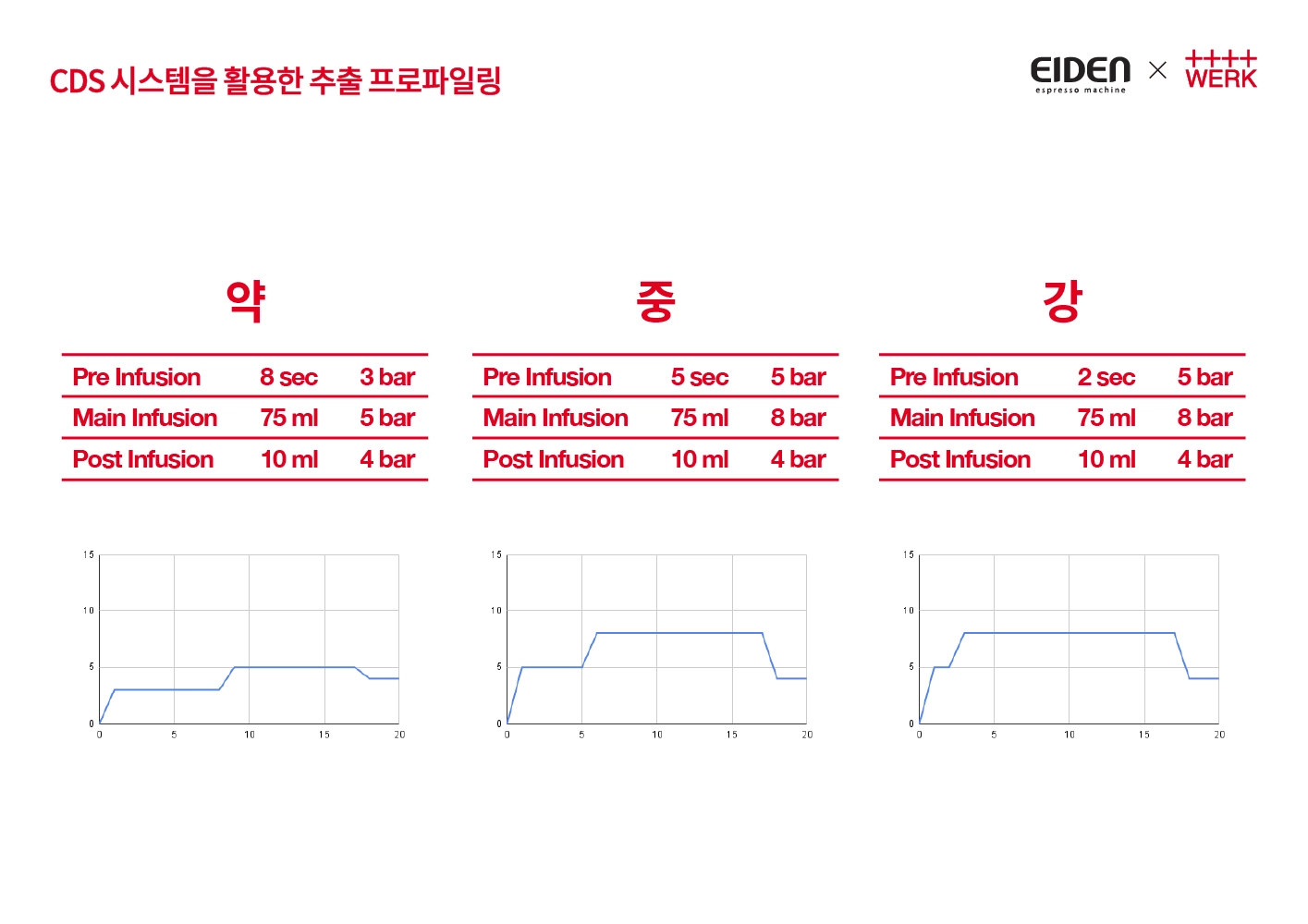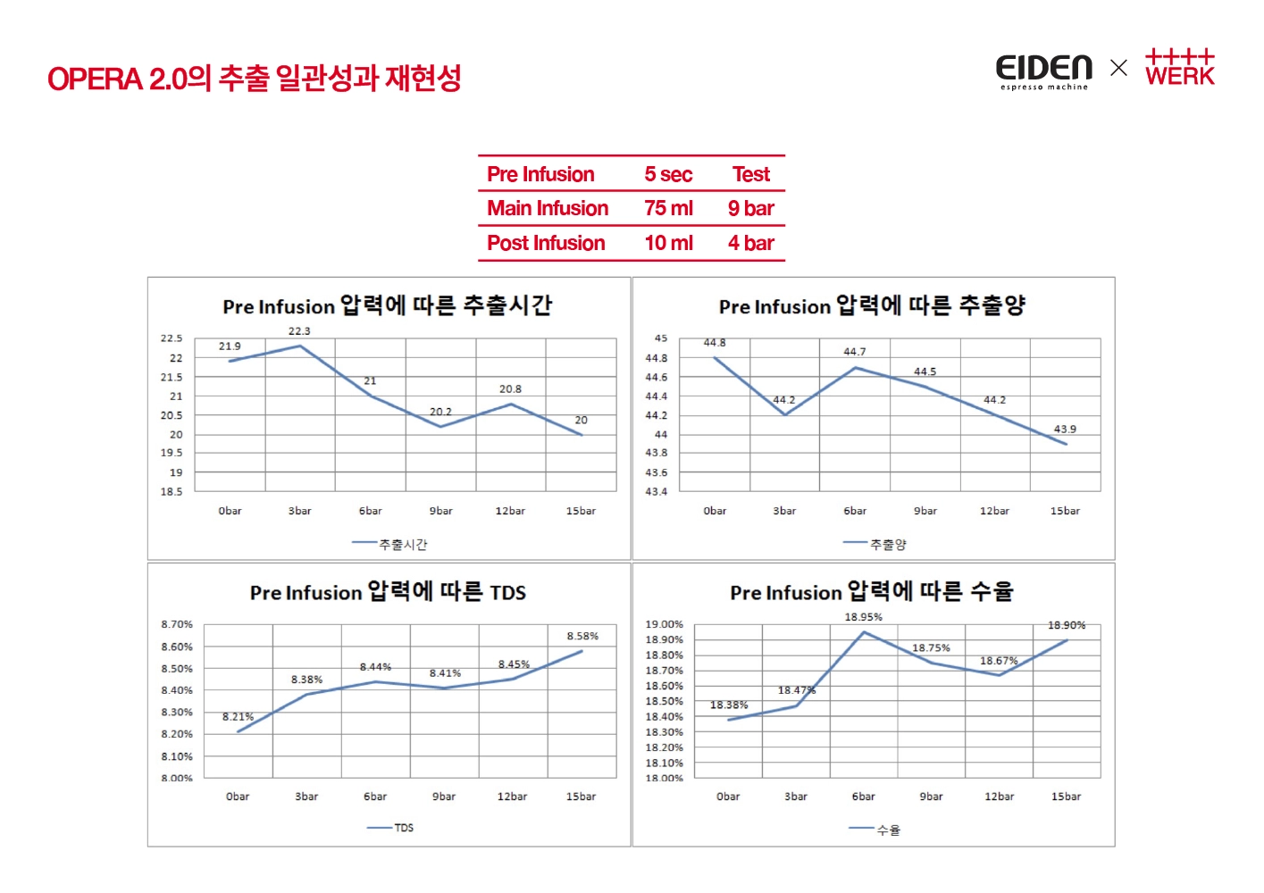 pre infusion - 압력 0bar, 3bar, 6bar, 9bar, 12bar, 15bar