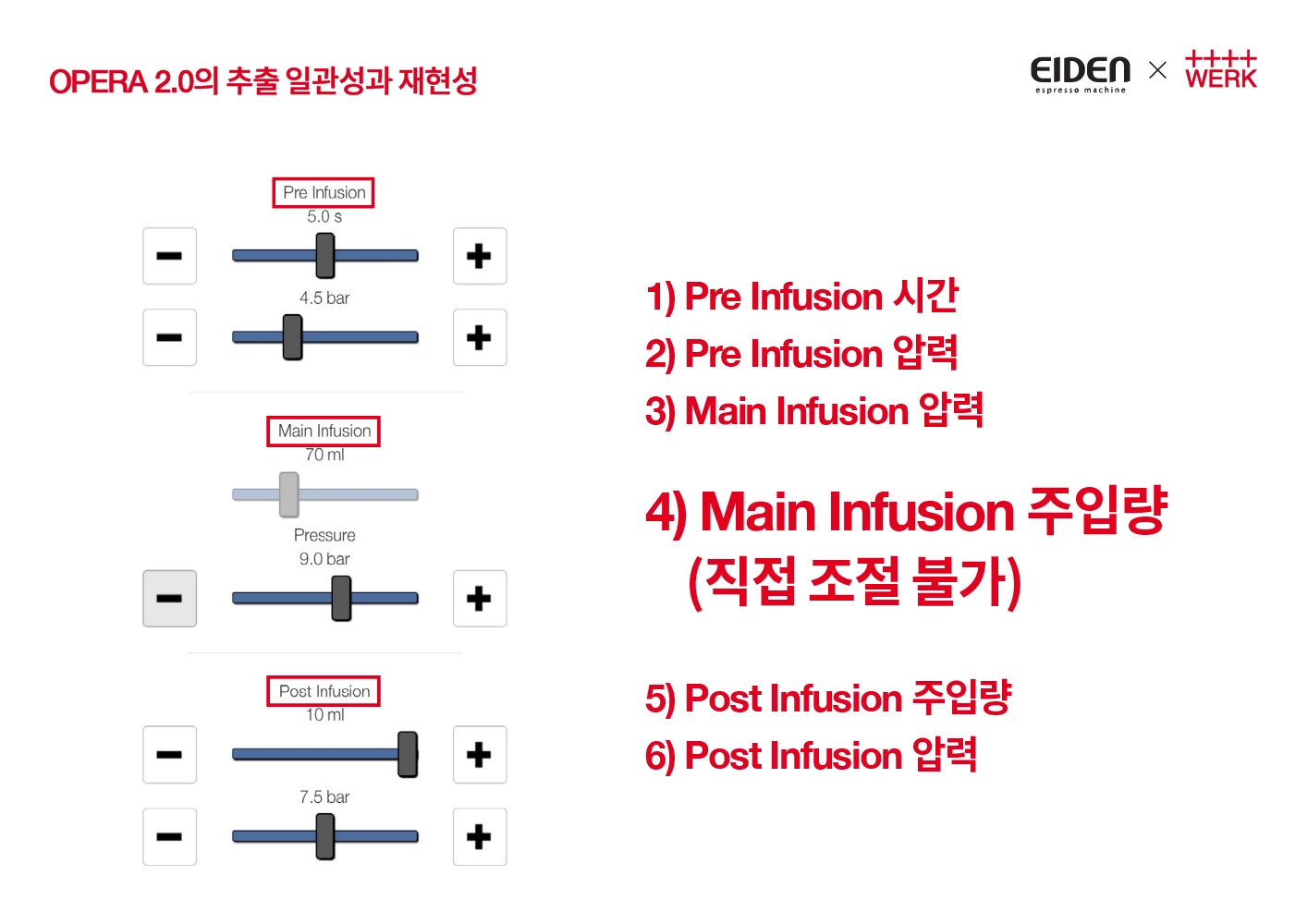 Pre infusion 과 Post infusion은 전체 추출에서 얼만큼 차지할지 각각 시간과 주입양으로 설정할 수 있도록 되어있습니다. 압력은 모든 구간에 상관없이 모두 0bar부터 15bar까지 설정이 가능합니다.