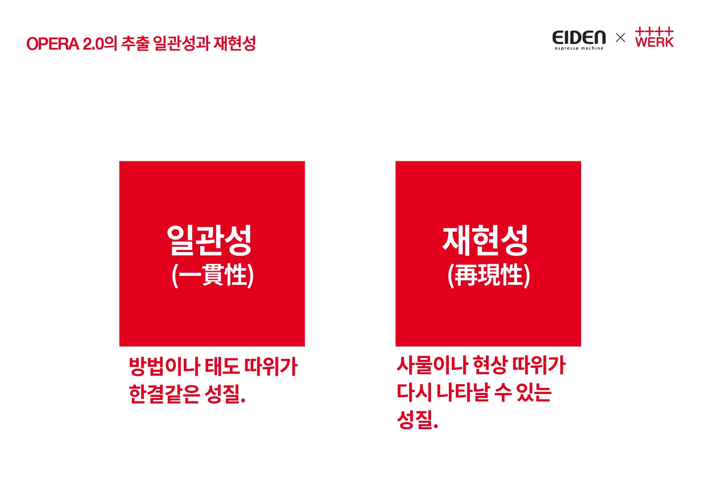 1번 주제에서 중요한 점은 일관성과 재현성을 에스프레소 추출이라는 관점에서 놓고 생각하였을 때 이 둘을 분리시켜 이해하는 것이 중요합니다.