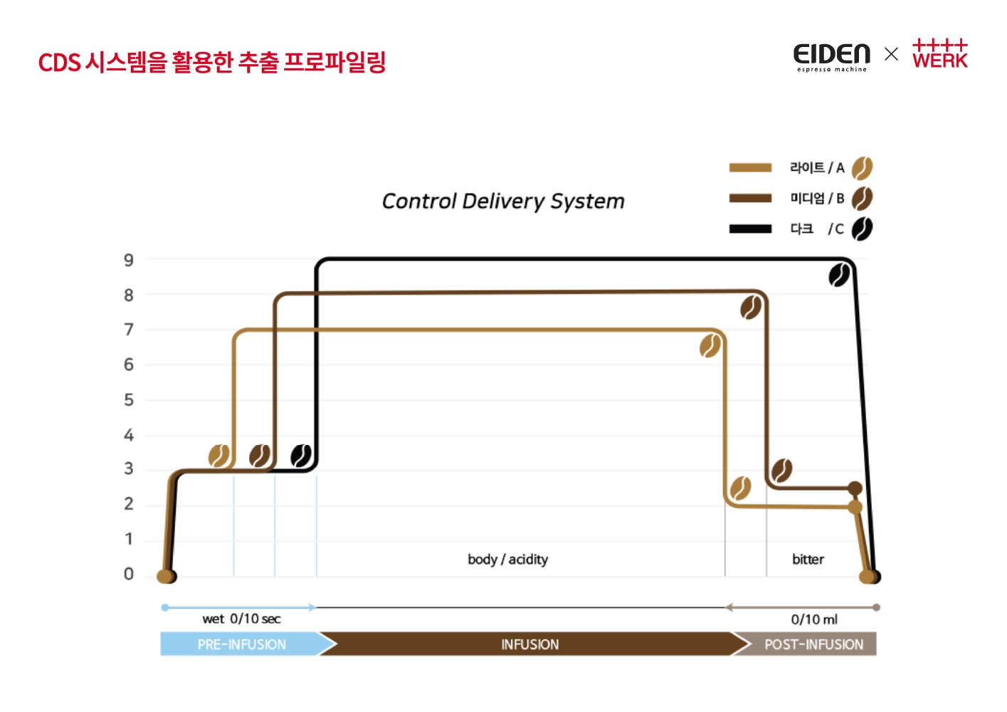 때문에 동일한 원두양 사용 대비 추출양이 같더라도 추출과정에서의 추출압력이 달라지게 되므로 맛의 뉘앙스에는 많은 차이가 있었습니다. 프로파일링에 관한 부분은 세미나 2부 내용이었던, CDS 시스템을 활용한 추출 프로파일링에서 조금 더 자세히 이야기해 보도록 하겠습니다.