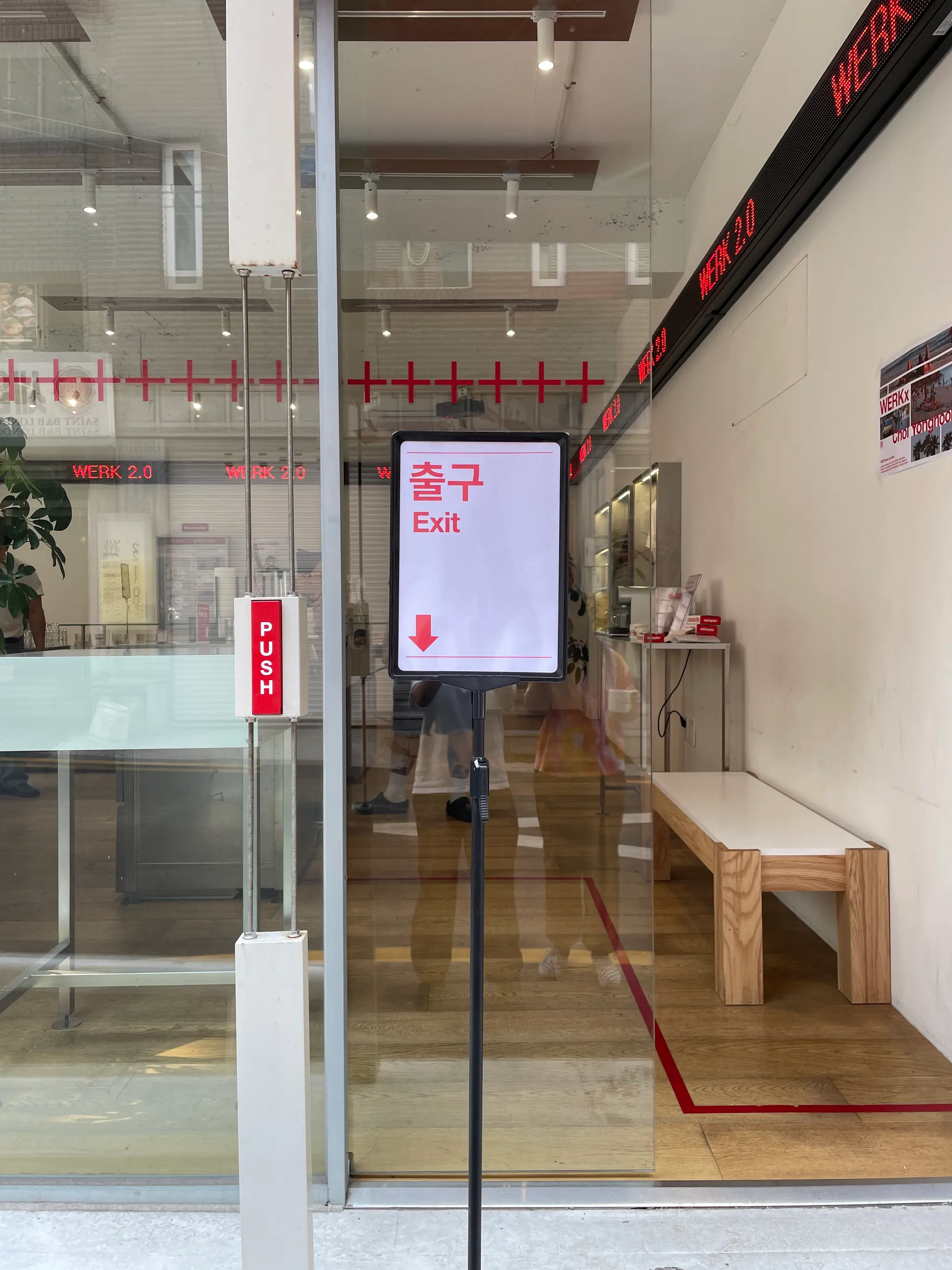 2)전면 화살표 <- <- <- <- | 통유리로 입구 못찾음 | 전면 윈도우시트 현재 것 제거 후 화살표로 입구 방향표시 |