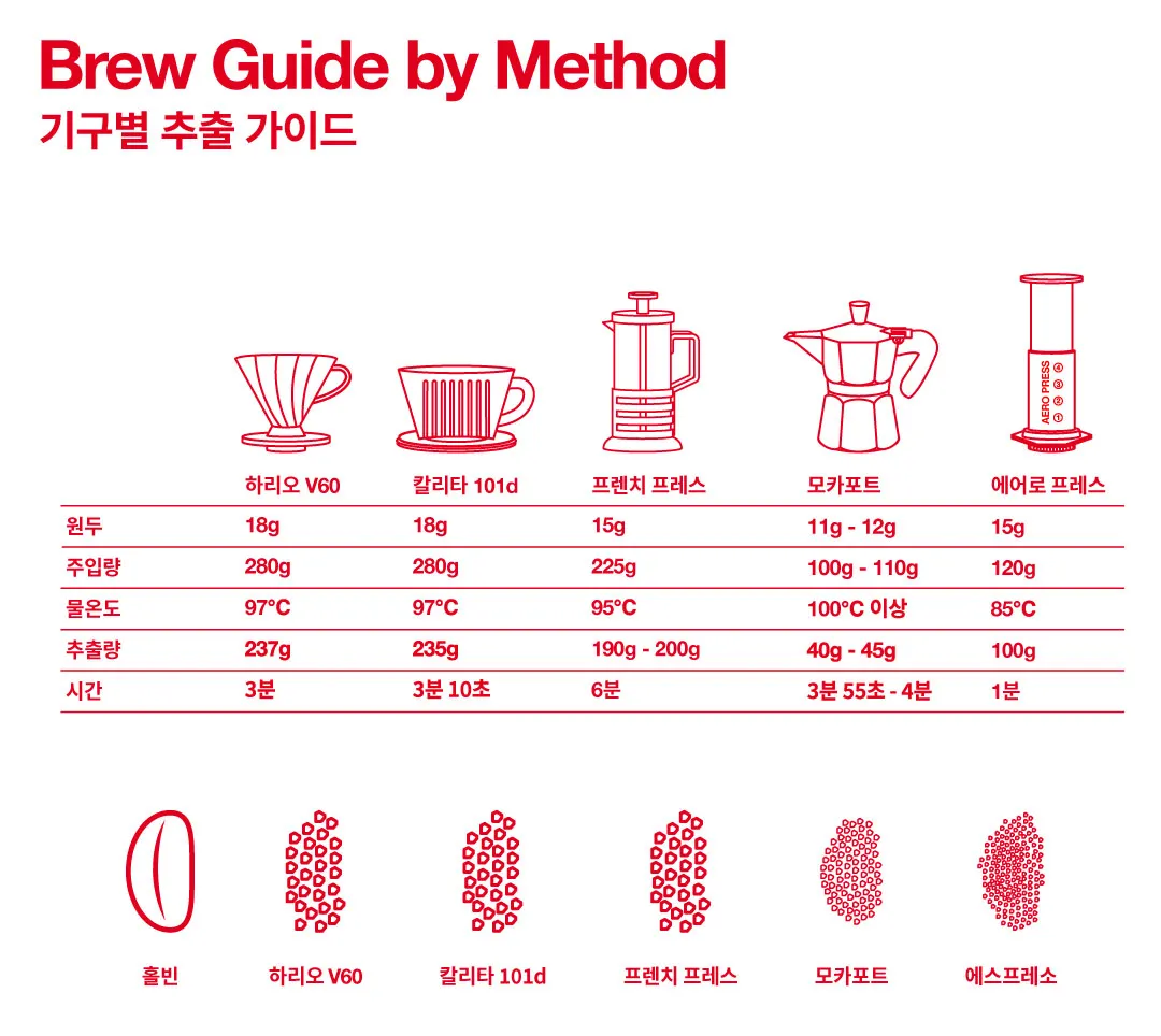 30초 후 50g씩 다섯 번에 나누어 총 280g 추출한다. (Ice로 내릴 경우, 30g씩 다섯번에 나누어 총 180g 추출한다.)